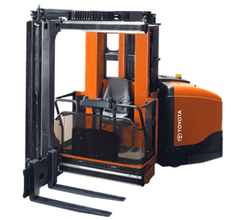 The Toyota Vector VCE150A very narrow aisle forklift is a powerful man-up combi forklift designed especially for pallet handling. The forklift's clear open front offers safe, highly effective order picking in very high racking systems.