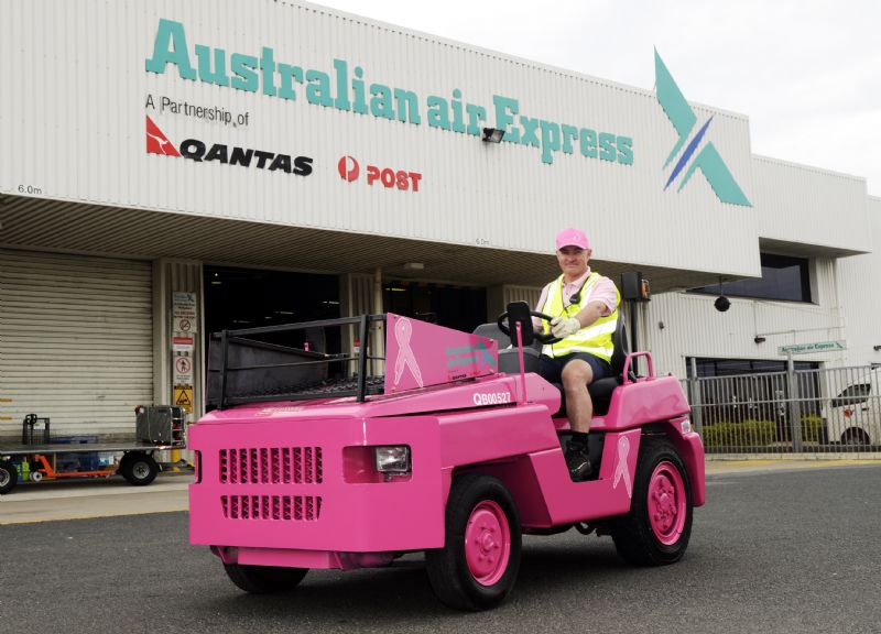 An Australian Air Express Toyota 2TD25 towing tractor with a special paint scheme for breast-cancer awareness